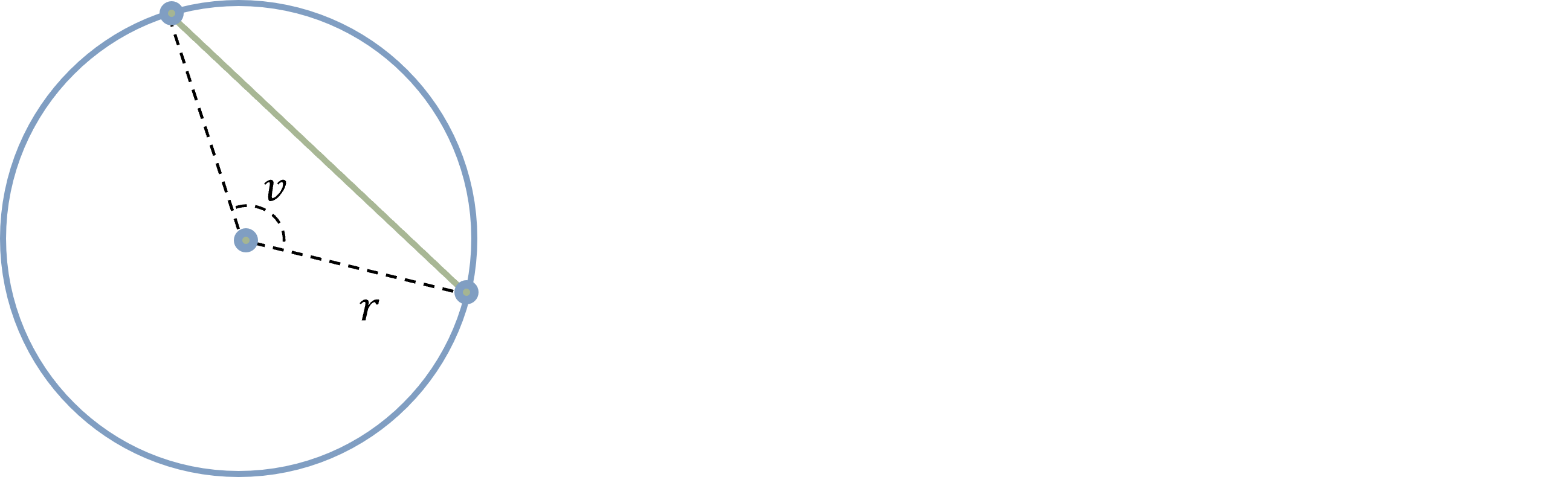 Mellem hvert af de to punkter kan der dannes to radier ind til cirklens centrum. Disse danner en vinkel (v), som vi skal kende for at beregne længden af korden.