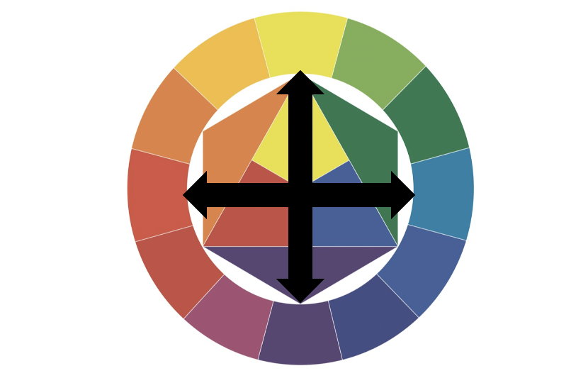 Som nævnt kan kontrastfarver også aflæses på farvehjulet. Det gør man ved at kigge på den farve, man ønsker at finde kontrastfarven til, og så se på farven, der står direkte modsat til den. Nedenunder er der indsat et billede med pile for at illustrere, hvad der menes.